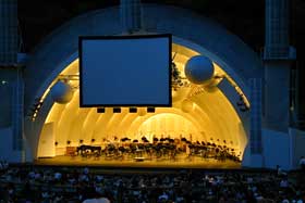 演奏まず最初は全員起立でアメリカ国歌。NYではこんなのはなかった。まあ、ゴールドスミス指揮のアメリカ国歌なんてなかなか聴けないだろう。他の演目はほとんどがこれまでのコンサートでやってきたもの。『ハムナプトラ』だけが新しい演目である。L.A.フィルの演奏はまずまずだったが、良いというほどではない。ところどころあからさまに外していたし、何よりもハリウッド・ボウルという会場はオケの生音を楽しむところではない。PAがかなり強烈で、静かなところでは空気中にスピーカーから漏れるサーという音が充満しているという感じ。しかも、音が遠い。遥か遠くで音が鳴っているという感じで、オケの迫力はない。やはり、あくまでもイベントだと割り切るしかないだろう。 |