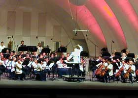 ハリウッド・ボウルは山をくりぬいて作った野外コンサートホールだ。とにかくだだっ広いというのが感想。ツアーで行った我々の席は中央から左寄りのボックス席。これは年間契約者の指定席で、普通は買えないものである。真ん中に折り畳み式のテーブルがある4人掛けの、相撲で言う枡席の感覚。周囲の現地人たちは料理やワインを持ち寄って、ピクニック気分。どうやら、こういうスタイルで楽しむのが日常になっているらしい。だから、ボックス席のほとんどは特にゴールドスミスや映画音楽のファンという訳ではない。ファンは後ろの方の一般席に多いようだ。開演は現地時間の20:30、つまり日没頃。寒いとは聞いていたが、予想以上。一応、前日のユニバーサルスタジオでトレーナーを買っておいたが、それでも最後の方には足りないくらいだった。 |