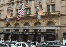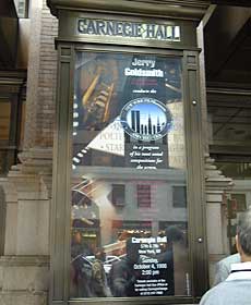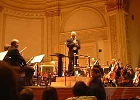 10月3日14時ESTに行われたジェリー・ゴールドスミス指揮NEW YORK FILMHARMONIC ORCHESTRA(以下NYFO)のコンサート。会場はカーネギーホール。オーケストラは当初NYフィルかと思っていたが、そうではない。NYのスタジオミュージシャンを集めて組織された新しいオーケストラで、その名の通り、映画やTVの音楽を演奏・録音するためのオケである。楽団員はすべて一流どころで、サントラの録音に参加した者が大半だという。それを証明するように、メンバーの年齢はかなり高め。若い者もいるが、それ以上に50歳以上のメンバーも多い。だいたい指揮者が69だしね(^_^;) このNYFOは今後色々な指揮者を招いて映画音楽コンサートを行うようなので、それも期待したい。ジョン・ウィリアムズなどが毎年夏にLAで行っているハリウッド・ボウル・オーケストラのNY版と考えればいいようだ。ゴールドスミスが最初になったのもその表れだろうし、NYの方が受けがいいからだと思う。 |