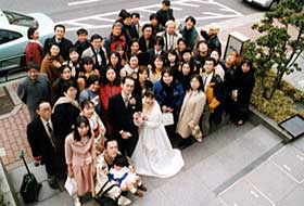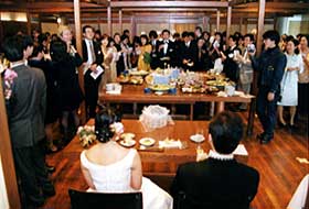12時半、開始予定だったが、5分ほど遅れて開始。後でわかったが、10名くらいはまだ到着していなかったようだ。私はブーケを持って会場内で待つ。司会の増田氏の言葉で人前式開始。私がブーケを相方に渡し、ブートニアを返してもらって客に一礼。坂口哲也氏が式を仕切る。が、ちょっととちってくれたおかげで、私の気は思いっきり楽になった。宣誓・両家父親の承認署名・ふたりの署名で婚姻成立。笹本祐一氏の乾杯の音頭の後、私が挨拶をして人前式は終わり。相方はちょっとしたお色直しで消える。私は数人に挨拶し、朝から何も口にしていないので何か食べようとしたところで、控え室に呼ばれる。ふたりそろって再入場、ケーキ入刀のため。酒も飲みたいのに。「新郎新婦入場」の司会の言葉の後、音楽がなかなか切り替わらない。『レンタ・コップ』のテーマが流れたところを見計らって会場へ。1分20秒後に曲の盛り上がりがあるので、それを目指す。ナイフを渡されて、「よし。ここだ」とケーキにナイフを突っ込む。曲はきっかり盛り上がりに。内心でガッツポーズ。が、そこで曲は急にヴォリュームを落とした。おい、打ち合わせと違うだろうが! 私は内心で拳を握りしめて震えていた。その後、ふたりは高砂に座り、田中啓文氏が祝辞の代わりにサックスで1曲。東京に出てくるのにサックスは重いので、ガイナックスの武田氏に借りたという。ありがたい話です。ああいう、とてもじゃないが人に勧められない小説を書く方にサックスを吹いていただけるとは光栄である。その後は歓談。ようやく食事が食える酒が飲める。人の輪に割って入って、友人知人に挨拶しつつ、自分で買ってきた酒と藤原省三氏が送ってくださった酒を飲み比べる。料理は幾つかは食べられたが、やはり全部は無理だ。後でデザートも出たらしいが、ほとんど食べられず。14時になってプレゼントタイム。クイズとビンゴの合わせ技は相方の発案。プレゼントはキャア4体、サイン本、相方の手作りアクセサリーなど。かなりの数で、出席者の半分近くは何かもらえたのではないかと。ちなみに出席者は104名。14時55分に私と相方の挨拶の後、退場。最後には『グラディエーター』の主題歌"NOW