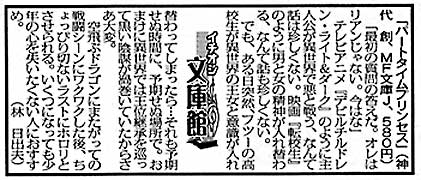 MFから著者校のゲラが届く。ついでに昨年11月に載った新聞記事も。しかし、どーしてスポニチ? 関西版? いや、嬉しいんだけどさ。この手のに紹介されたのは2度目。最初はデビュー作が《週刊宝石》に一般書籍と同じ扱いで。おかげで妙に愛読者ハガキの年齢が高かった覚えが。でも、あれは最初から年齢高くしてた作品だったから狙いどおりなんだが。