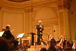 10月3日14時ESTに行われたジェリー・ゴールドスミス指揮NEW YORK FILMHARMONIC ORCHESTRA(以下NYFO)のコンサート。会場はカーネギーホール。オーケストラは当初NYフィルかと思っていたが、そうではない。NYのスタジオミュージシャンを集めて組織された新しいオーケストラで、その名の通り、映画やTVの音楽を演奏・録音するためのオケである。楽団員はすべて一流どころで、サントラの録音に参加した者が大半だという。それを証明するように、メンバーの年齢はかなり高め。若い者もいるが、それ以上に50歳以上のメンバーも多い。だいたい指揮者が69だしね(^_^;) このNYFOは今後色々な指揮者を招いて映画音楽コンサートを行うようなので、それも期待したい。ジョン・ウィリアムズなどが毎年夏にLAで行っているハリウッド・ボウル・オーケストラのNY版と考えればいいようだ。ゴールドスミスが最初になったのもその表れだろうし、NYの方が受けがいいからだと思う。