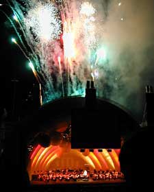 さほど盛大とは言えない拍手の後、4回舞台に戻ってきたゴールドスミスが指揮台に戻る。花火が騒々しかったので、とアンコールはもう一度"FIREWORKS"。前日のアンコールでは『シャドー』と『スタートレック/叛乱』をやったらしい。合間のトークは『スタンド』のショーン・コネリーの髪型の話、『グレムリン』出演の話(奥方ののろけ付き)、TVの音楽製作に対する話など。まあ、珍しい話ではなかった。とは言っても、聞き取れなかった話もあるので、自信はない(^_^;)